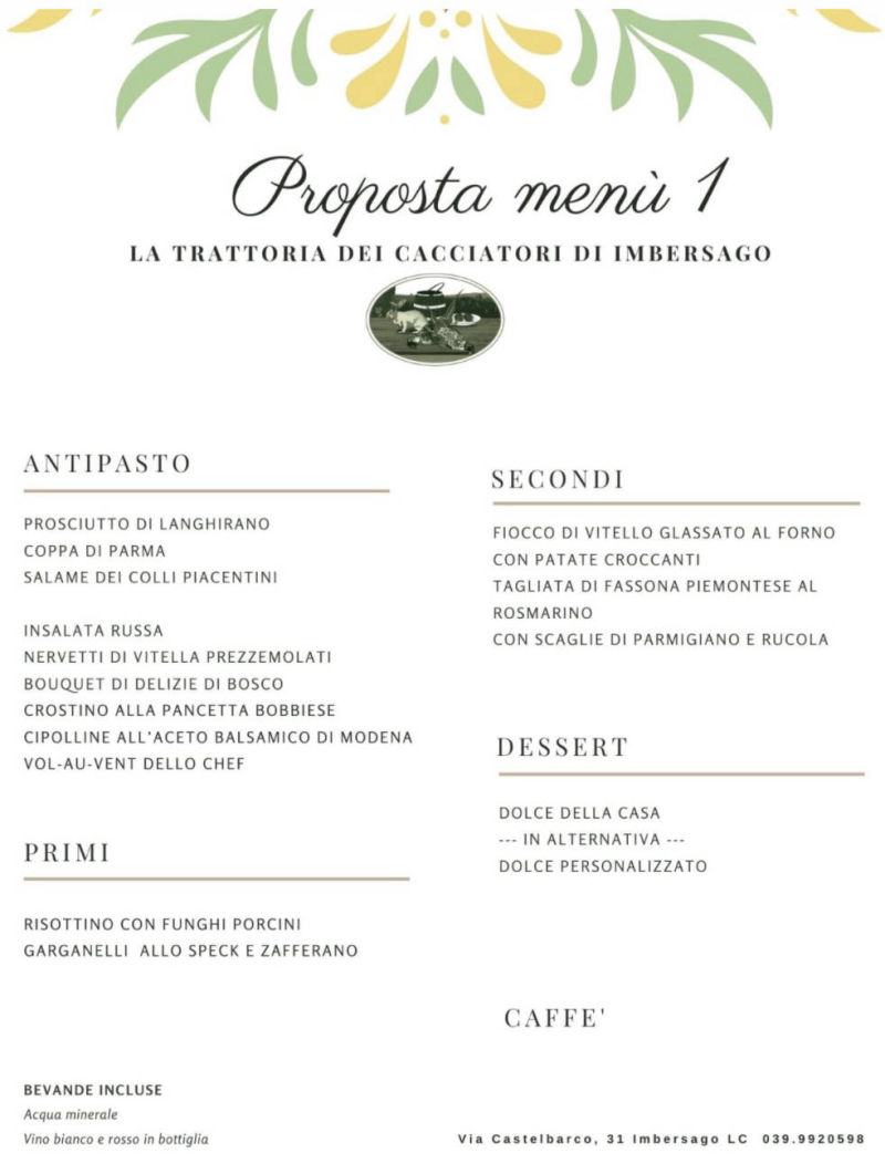 si potrà richiedere (sempre in loco) un menù da € 25,00 che comprende un primo (bianco/rosso/verde),